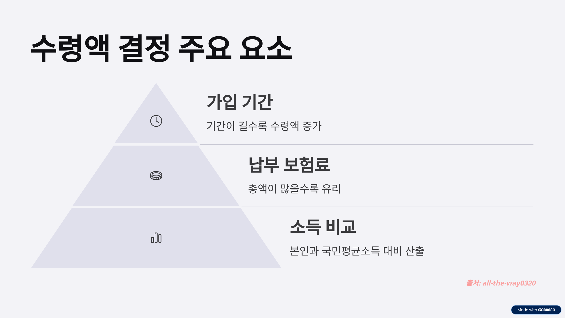 국민연금 수령액은 국민연금에 가입한 사람이 일정 나이가 되었을 때 받을 수 있는 월별 금액을 의미합니다. 수령액은 크게 다음 세 가지에 따라 달라집니다.
