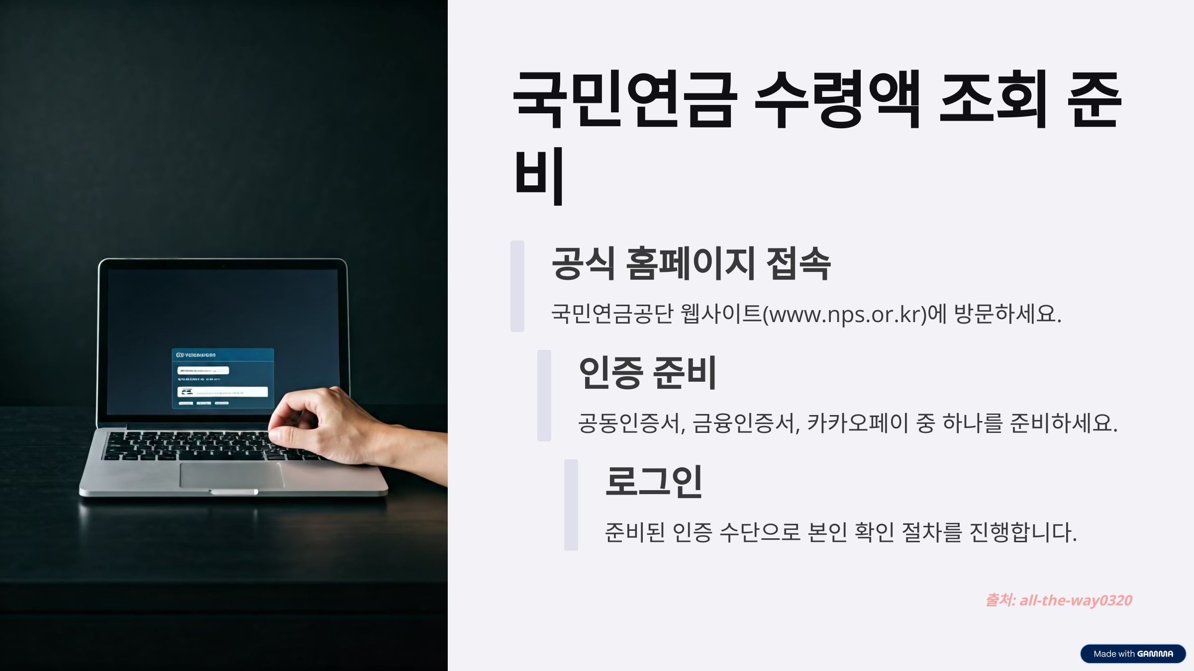 국민연금 수령액은 국민연금공단 공식 홈페이지 또는 정부24, 내연금 사이트에서 조회할 수 있습니다. 가장 쉬운 방법은 다음과 같습니다.