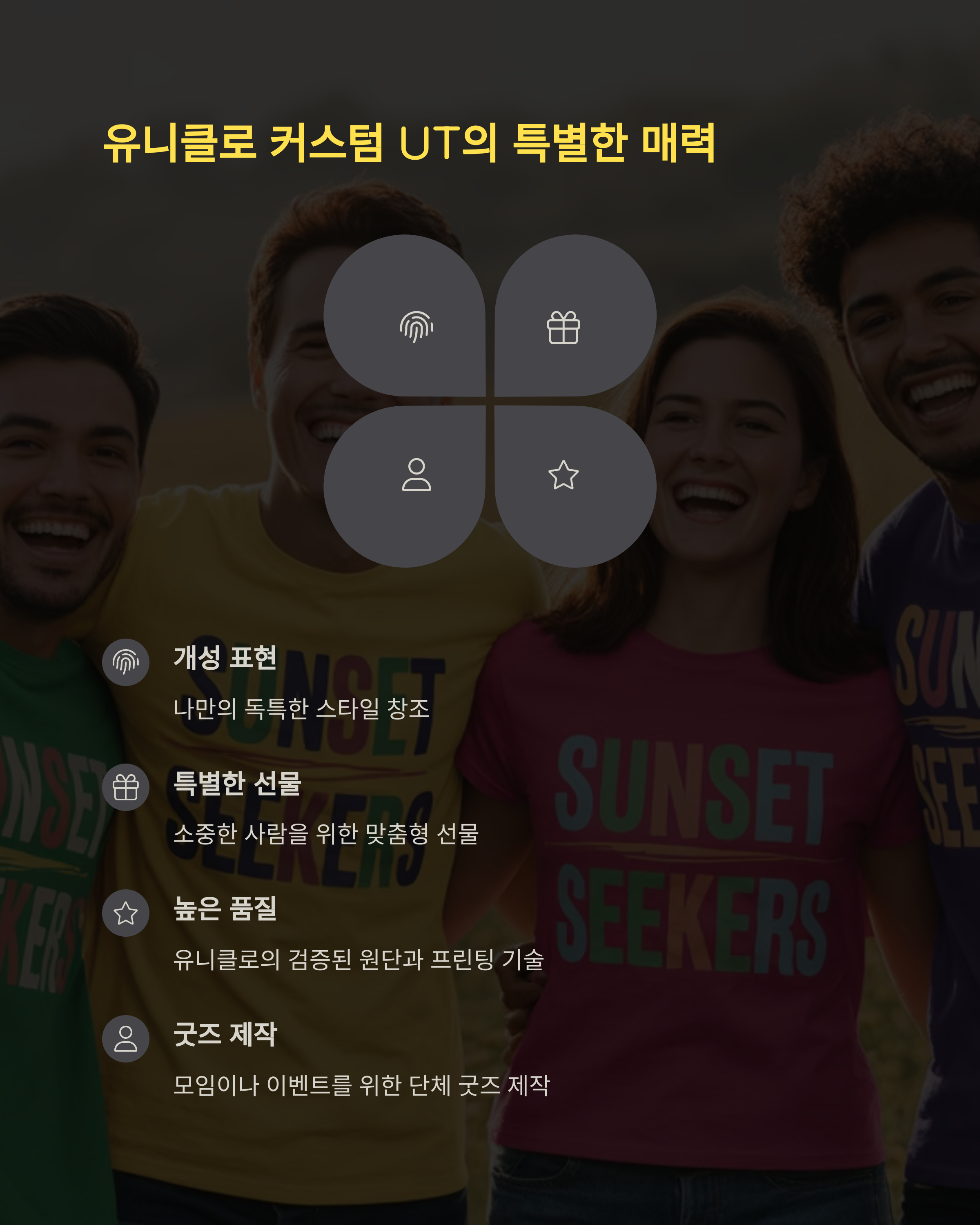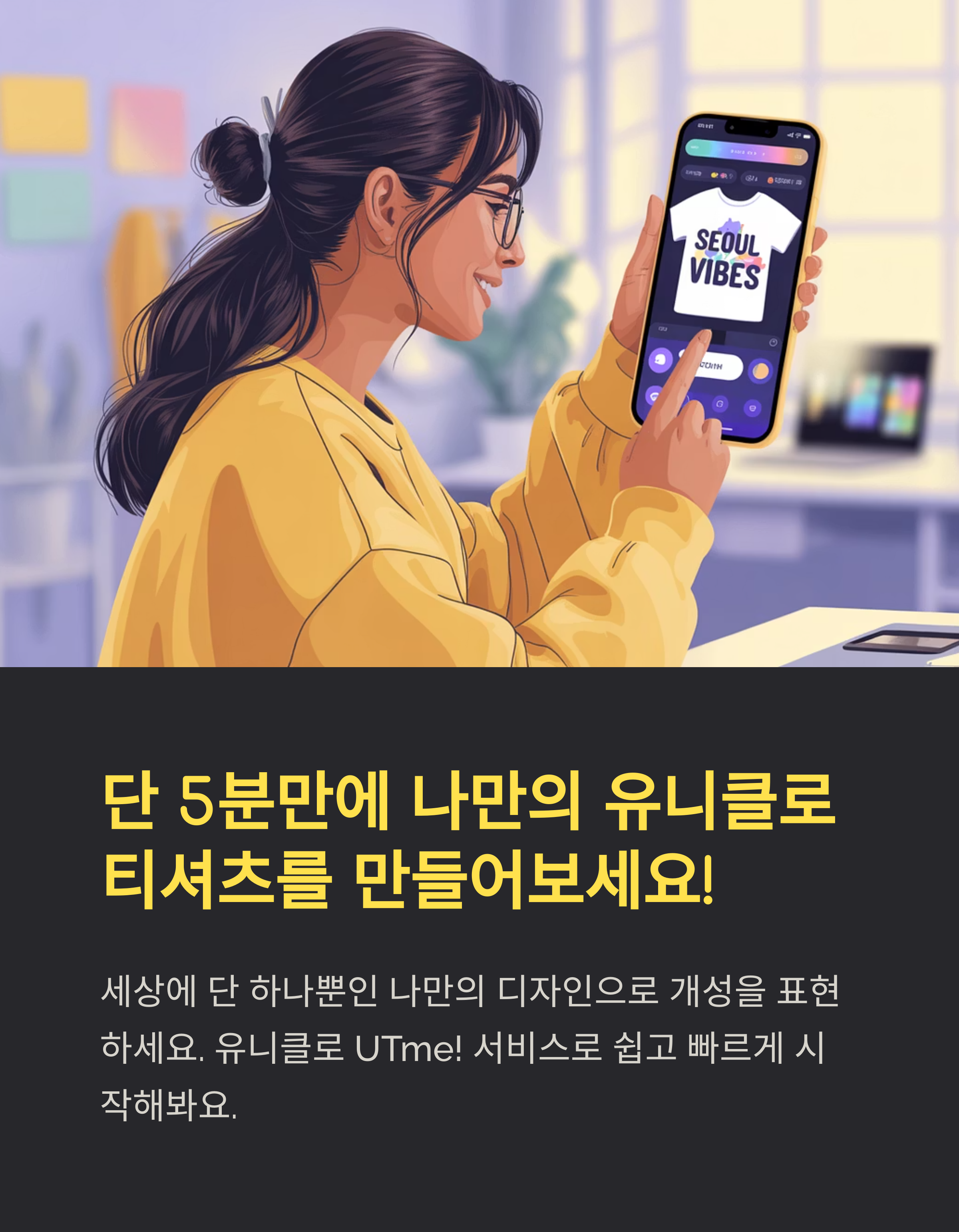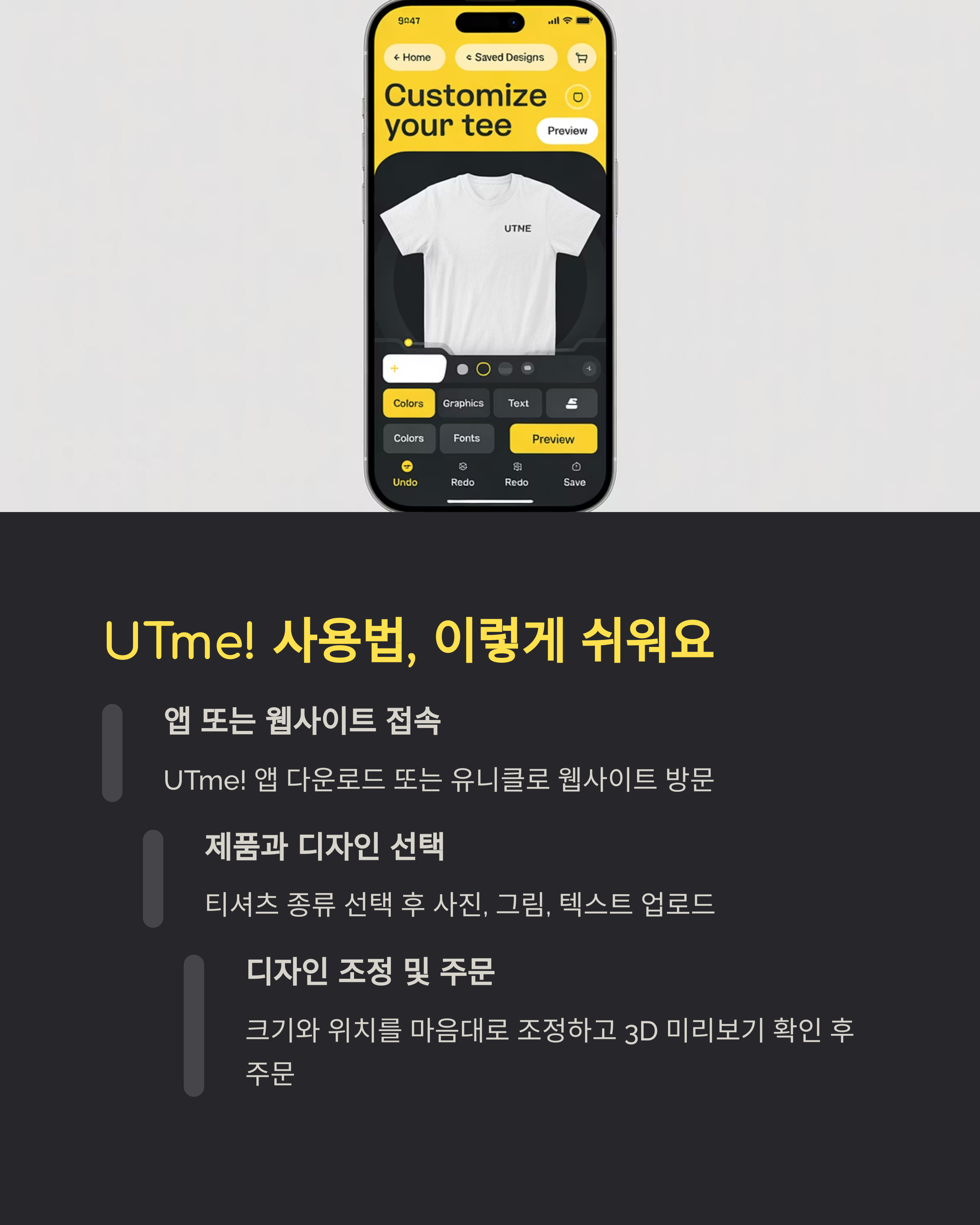 세상에 단 하나뿐인 나만의 티셔츠, 유티클로 커스텀 UT로 쉽게 만들 수 있습니다. 간단한 조작만으로도 멋진 결과물을 얻을 수 있으니 지금 바로 UTme! 플랫폼에 접속해 디자인을 시작해보세요.