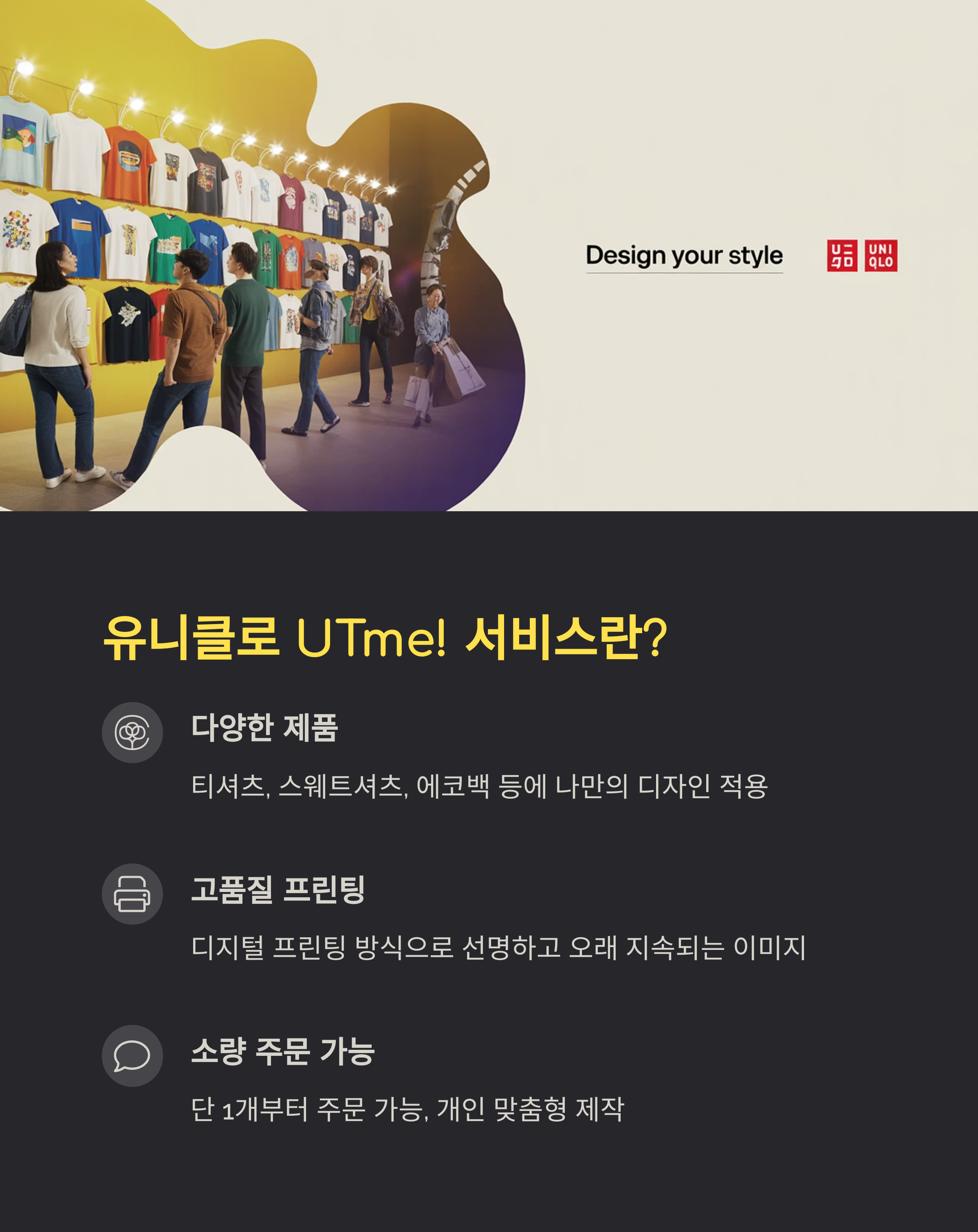 유티클로 커스텀 UT는 유니클로의 UTme! 플랫폼을 통해 고객이 직접 디자인한 이미지를 티셔츠, 에코백 등 다양한 제품에 인쇄할 수 있는 서비스입니다.