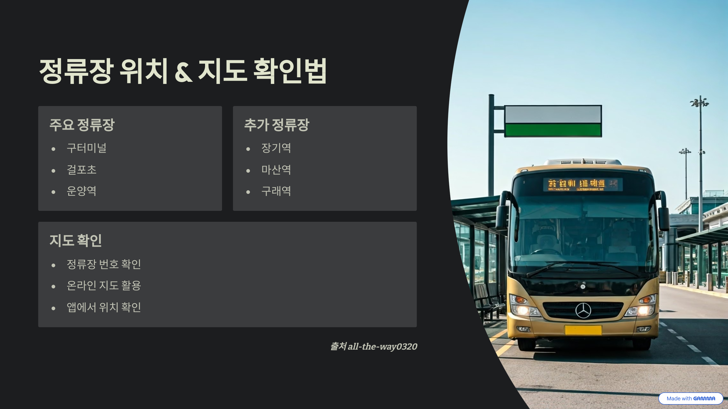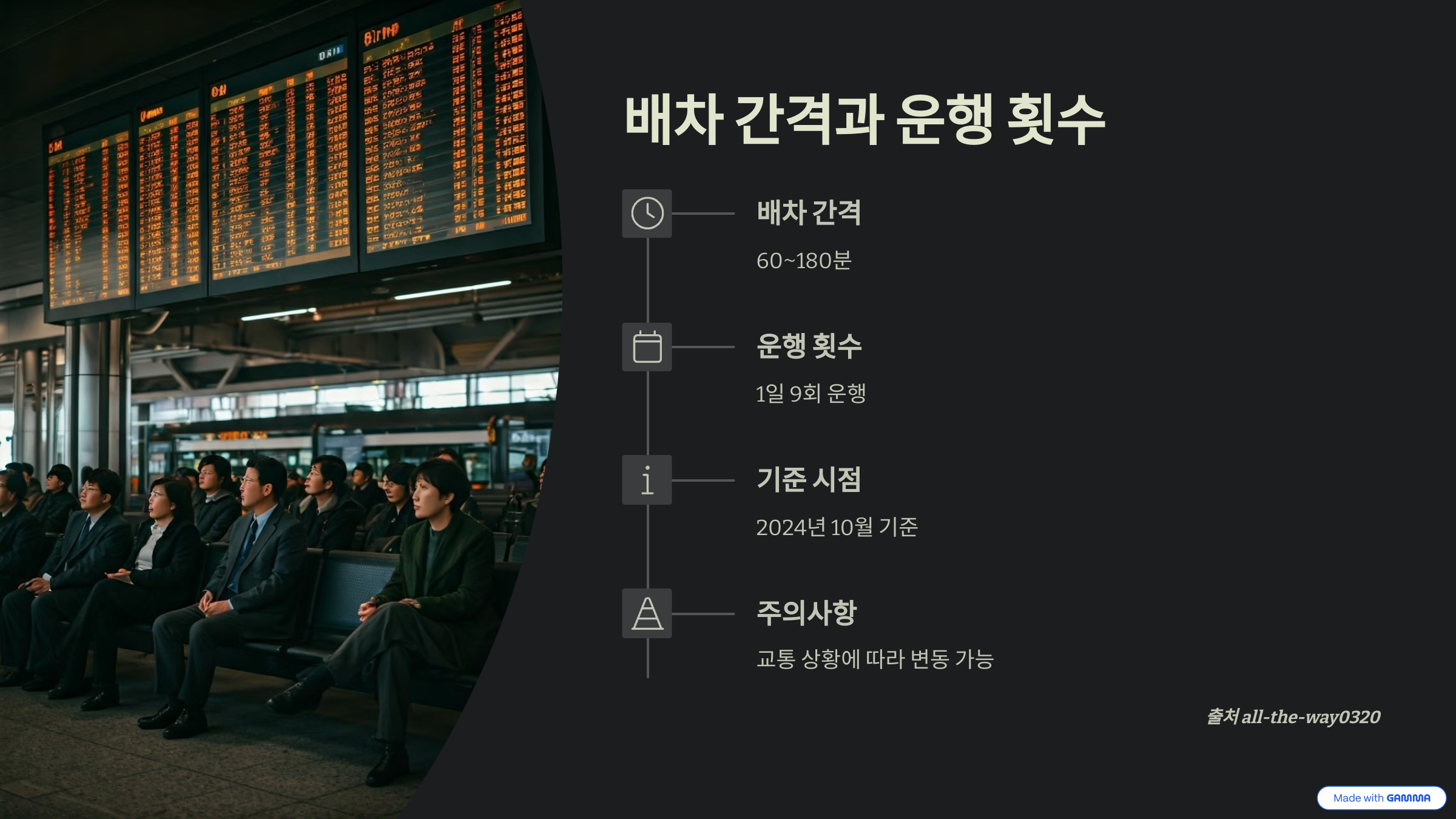 - 결제 수단: 교통카드, 현금, 모바일 예매